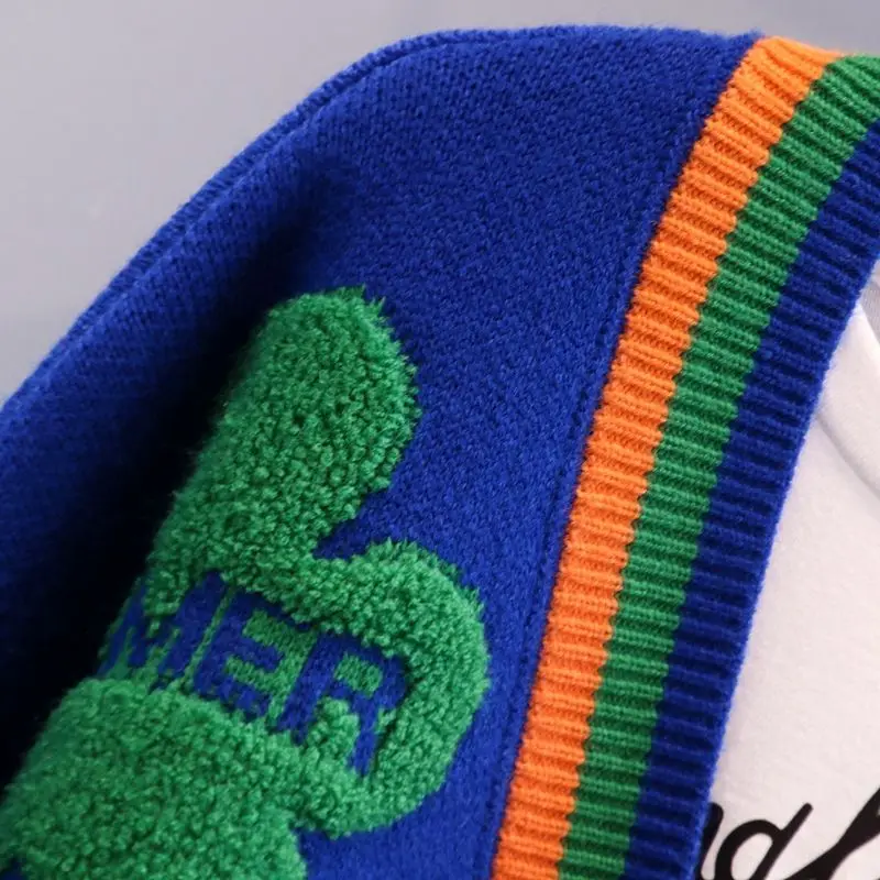 Blue Acrylic Knit V-Neck Letter Flower Casual Women’s Cardigan Sweater Single Breasted Cardigan For Women Clothing Thick Winter