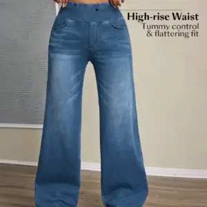 Women’s high-rise wide-leg jeans with tummy tuck, slim fit, made from stretch denim fabric, are stylish for casual everyday wear