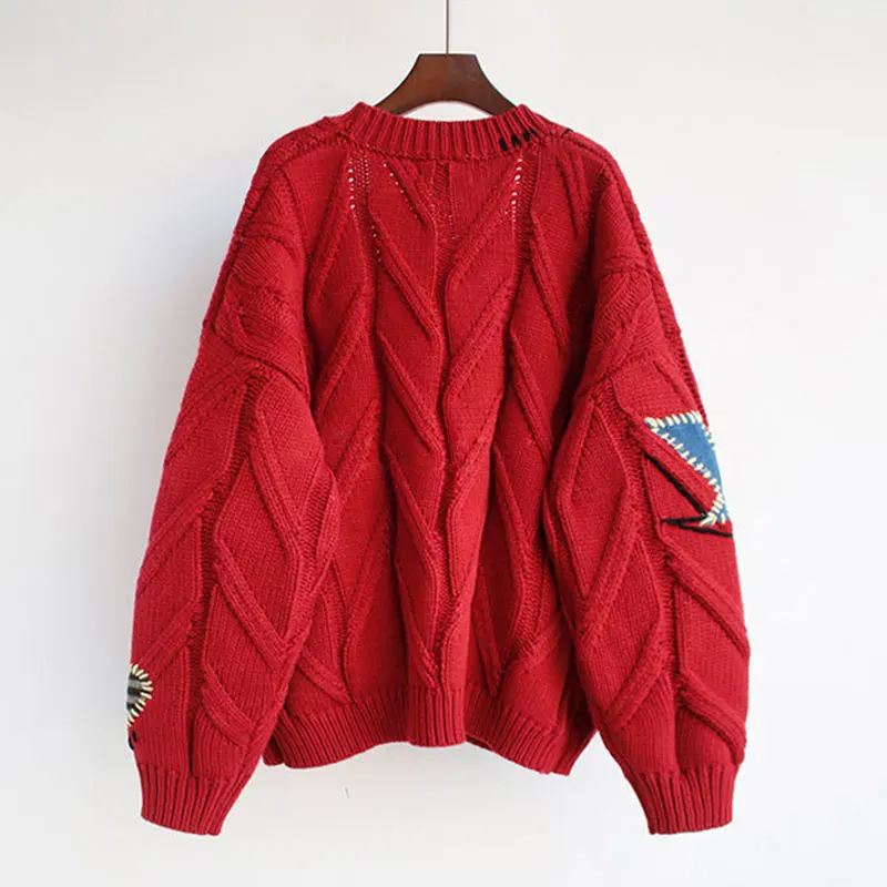 Embroidery Patchwork High Street Thick Knit V-Neck Women’s Cardigan Sweater Single Breasted Cardigan For Women Clothing Winter
