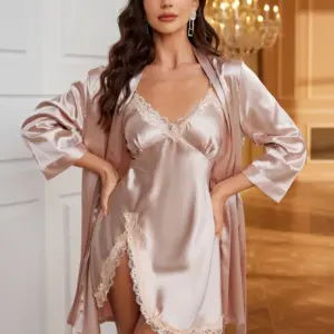 Women’s Satin Lace Trimmed Pajama Set Sexy Cozy Two Piece Pajama Set Home Wear For Fall/Winter
